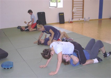 Den praktischen Teil übernahmen dann Angelika und Alexander Essig. Geübt wurden Griffbefreiungen, Tritte, Blocks und Schläge, und auch das Befreiungen aus der Bodenlage. Auch einfache Vorsichtsmaßnahmen für den Alltag und Verteidigung mit Alltäglichen